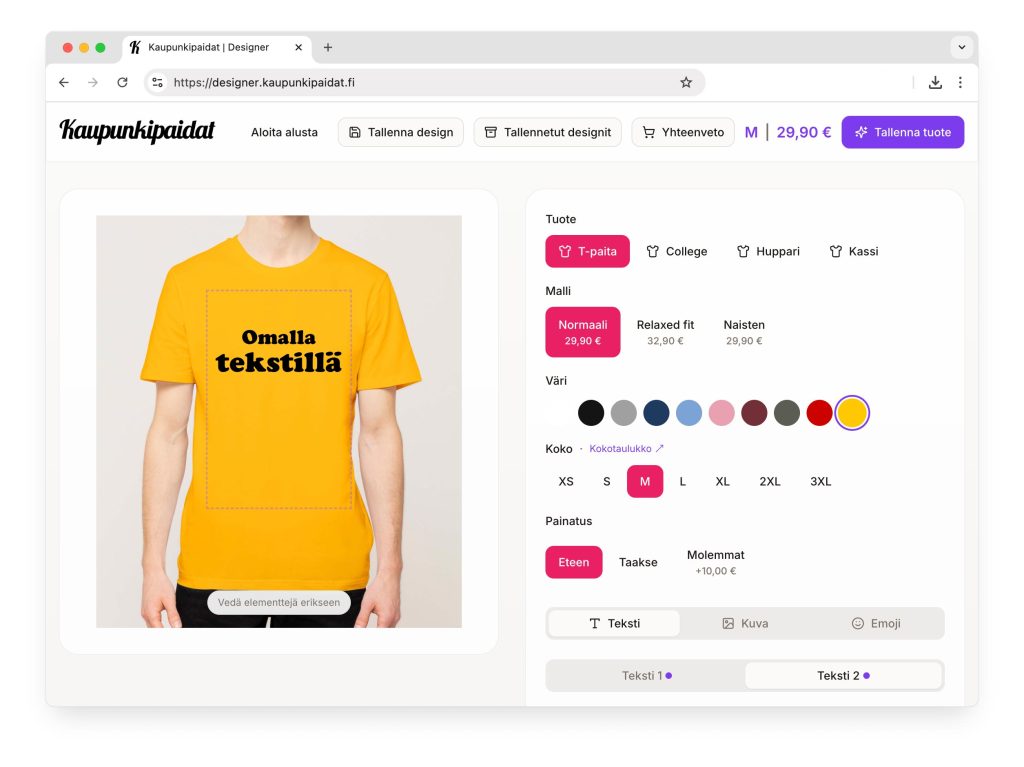 Suunnittele oma uniikki tuotteesi T-paidat, colleget, hupparit, kassit Aloita suunnittelu 60°12′15″N / 24°58′30″E Mikä on sinun paikkasi? Huippusuositut koordinaattipaidat koko Suomen kartalta. Jos et löydä omaasi, niin lisäämme sen valikoimaan. Siirry kauppaan Nyt myös Love-paidat kotiseuturakkaille Love-paidat löydät kunkin kaupungin alta verkkokaupastamme. Vuosilukupaidat Siirry vuosilukuvalikoimaan Kirjainpaidat Siirry kirjainvalikoimaan Tuotteemme Tuotteet omalla tekstillä (458) Aakkoset (116) Roomalaiset vuodet (318) Vuosiluku (318) Näytä koko valikoima Kaupunkipaidat-tuotteet on valmistettu vastuullisesti ja painettu Suomessa. LAADUKKAAT MATERIAALITPaidat on valmistettu luomupuuvillasta ja kierrätyspolyesterista. PAINETTU SUOMESSAPaidat painetaan Arabiassa Helsingissä.